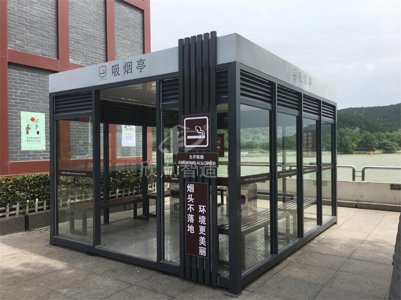 鋼化玻璃吸煙亭:光線明亮,安裝方便,工廠組裝好成品整體運(yùn)輸?shù)跹b到位,堅(jiān)固耐用,使用壽命至少十年,重型鋼結(jié)構(gòu),抗臺(tái)風(fēng)。頂部使用鋁板防水隔熱材料,保證下雨不漏水,隔音效果優(yōu)良。并且內(nèi)置電路,只要通電就可以在亭內(nèi)使用電力設(shè)施,室內(nèi)配置休息椅和煙灰桶,方便的功能,時(shí)尚的外觀,實(shí)在是廣大禁煙場(chǎng)所的不二之選!